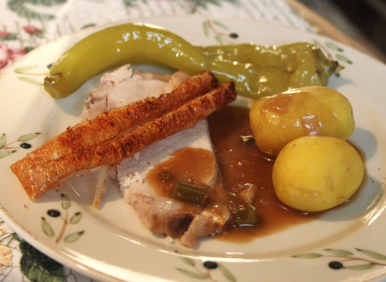 Efter en times tid lægger man sivri pebrene hele ned sammen med stegen. De smager fantastisk som tilbehør, når de er bagt på den måde, og de giver også smag til sovsen.