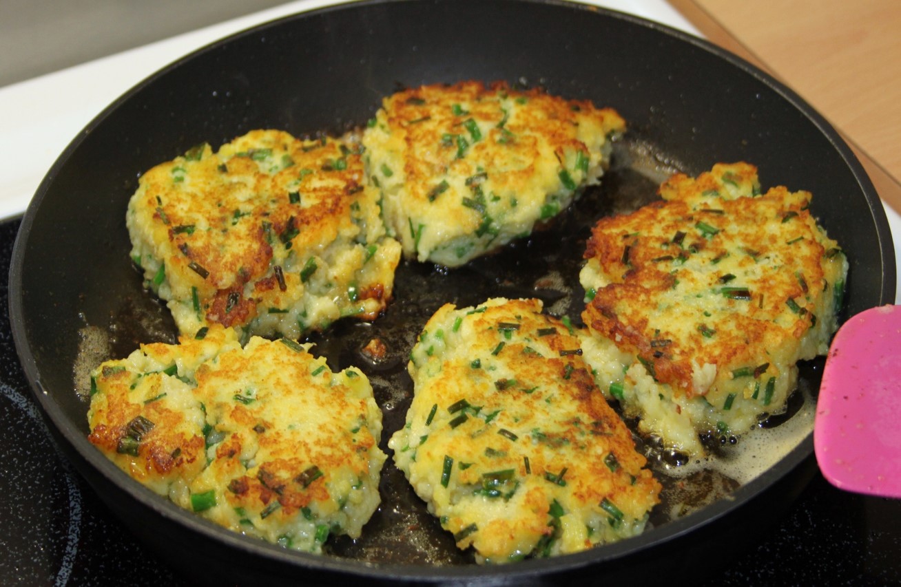 Mos kartoflerne og rør dem med resten af ingredienserne. Steg klatter af kartoffelmosen på panden i smør, til de er sprøde på begge sider og gennemstegte – ca. 5 minutter på hver side.