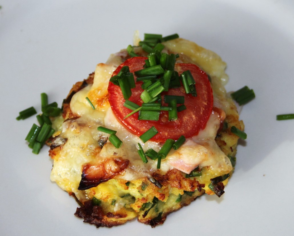 Uden pynt på toppen er de lækkert tilbehør. Med pynt bliver de et helt måltid i sig selv. Man kan bruge mange forskellige toppinger, men den her med skinke, ost, tomat og purløg er rigtig god. Lidt som en pizza – lidt som en ovnmad, men helt sin egen.