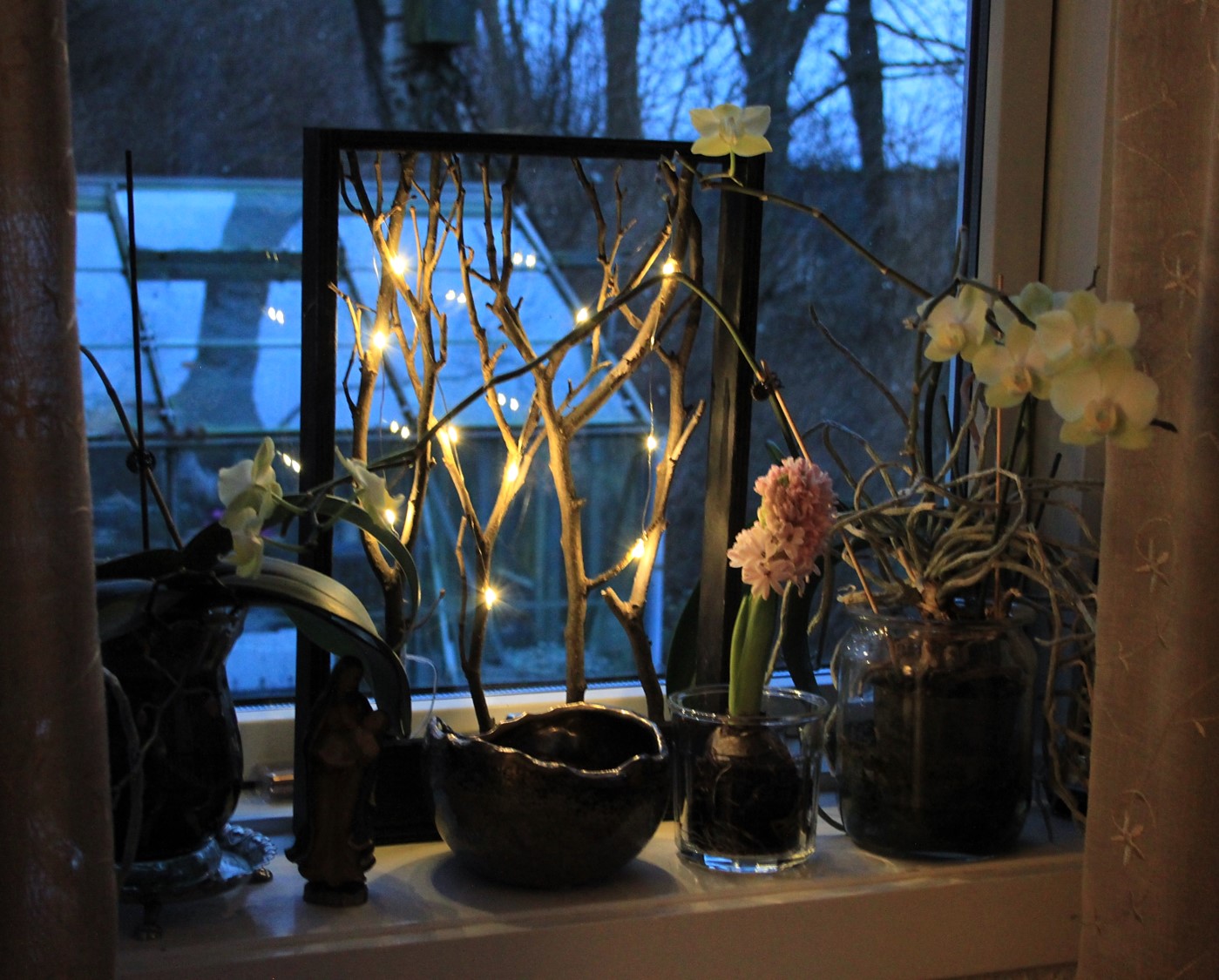 1. Det ser ud til, i har haft mere frost ,end vi har her på Nordfyn. Efter en gå-tur er det dejligt, at komme ind i varmen. Jeg kan godt lide dit vindue. Jeg bruger også henkogningsglas til løgplanter. lige nu har jeg en hvid Amaryllis, der lige står på spring til at åbne sig.
