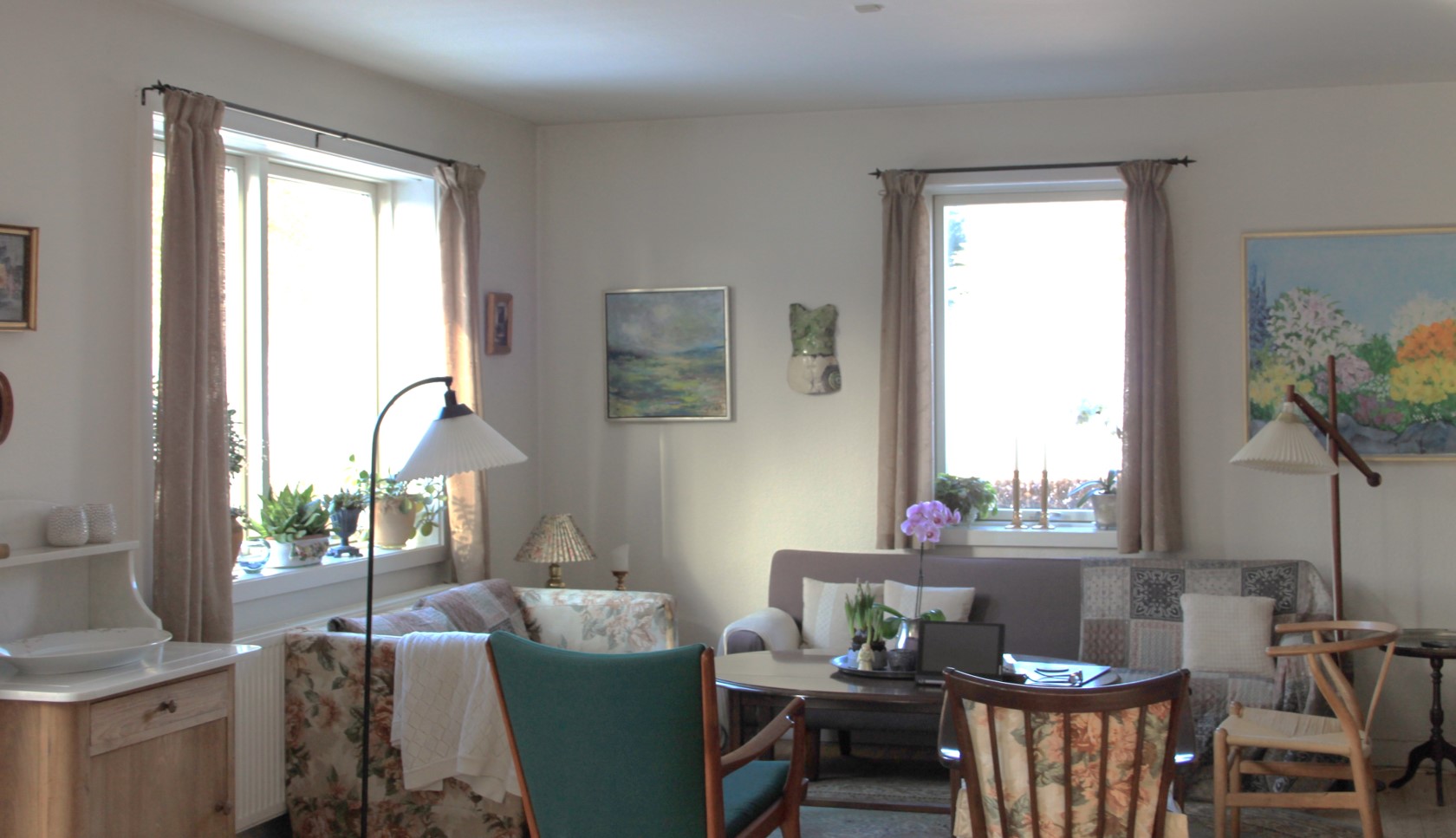 Din stue ser så hyggelig og indbydende ud. Jeg er især vild med det smukke billede du har hængende. Det lyser af sommer og glæde. Servanten er også rigtig flot, og den har stadig sin fine bagbeklædning på. Den servante jeg har, er bagbeklædningen taget af, øv osse