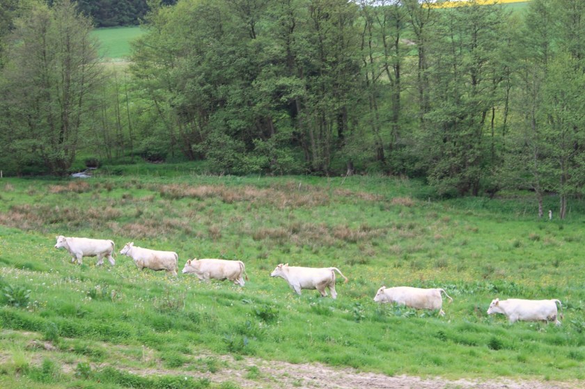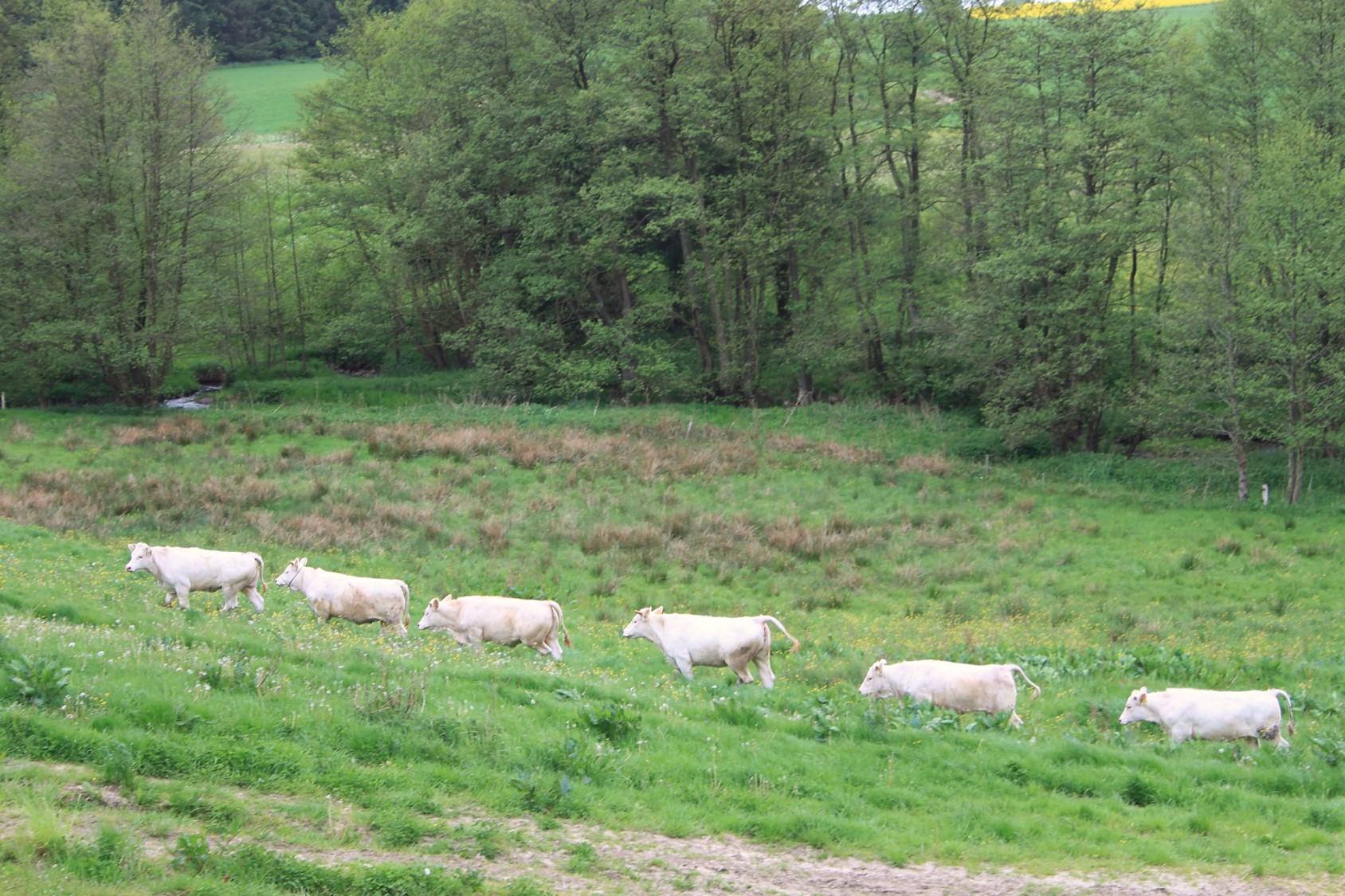 Så er der igen liv i marken. Seks, smukke charolais kvier kom hertil i går aftes, og efter en nat i fangfolden, hvor de kunne vænne sig til lyde og lugte – og falde lidt til ro efter køreturen – er de nu sluppet fri i engen.