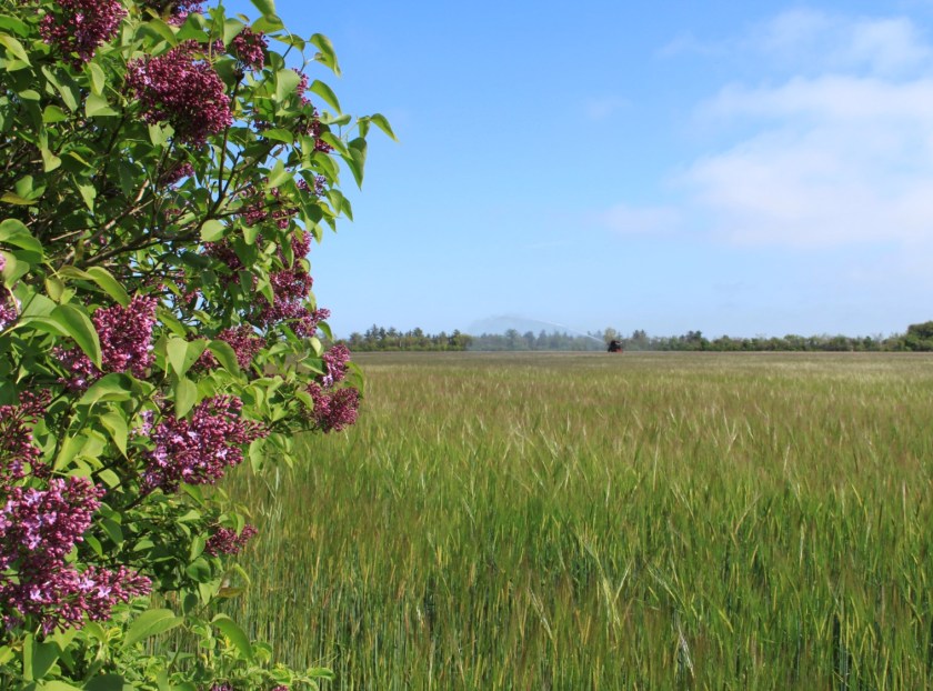 Går man helt ud til der, hvor haven går ud i marker, over den lille bro, mødes man af dette syn. Vidstrakte marker – og syrener i hegnet.