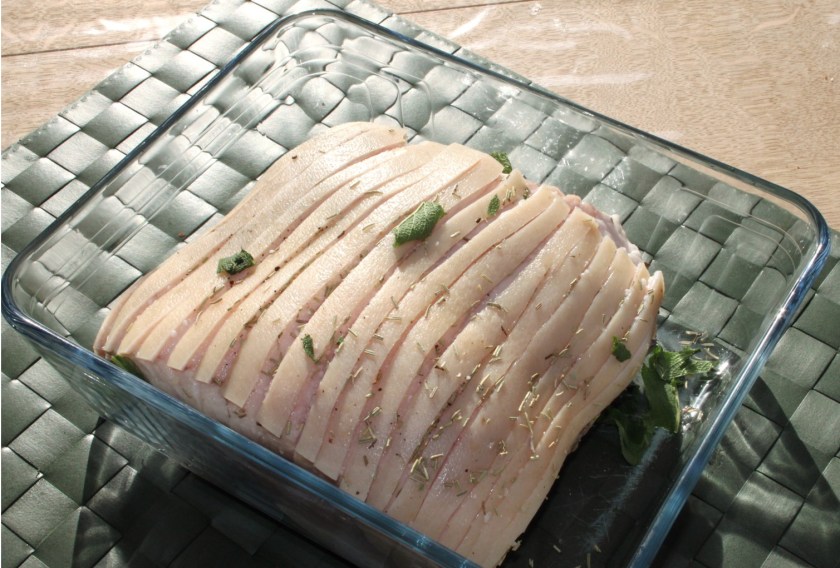 Når stegen er klar – kernetemperatur på 70-75 grader – hælder du stegeskyen fra og skummer den for fedt. Skyen er til sovsen, og den kommer til at smage fortryllende af krydderurterne. Skyen skal bare jævnes med lidt Maizena. Er den for salt, kan lidt fløde hurtigt gøre noget ved det.