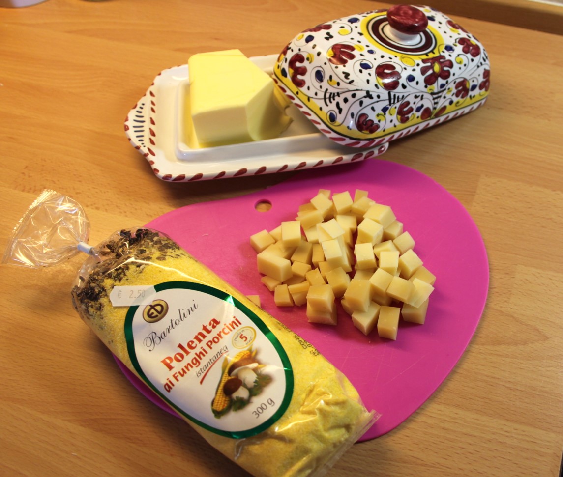Begge dele findes i indvandrerbutikkerne herhjemme til en fornuftig pris. Vi havde polenta i den hurtige version med tørrede svampe med hjem fra Aostadalen, ligesom vi havde Fontina ost. Men rygtet siger, at Gruyere ost kan bruges i stedet for, hvis man ikke kan finde Fontina.