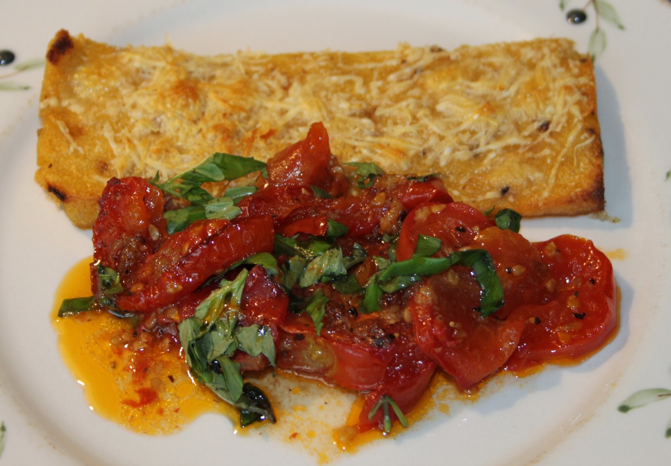 Vi spiste polentaen med bagte tomatskiver til – tomater i skiver blandet med rigeligt presset hvidløg, drysset med salt, peber og lidt brunt rørsukker, og dryppet med olivenolie. Bag fadet en 40 minutters tid på 200 grader i ovnen og drys med rigeligt hakket, frisk basilikum, når du tager det ud af ovnen.