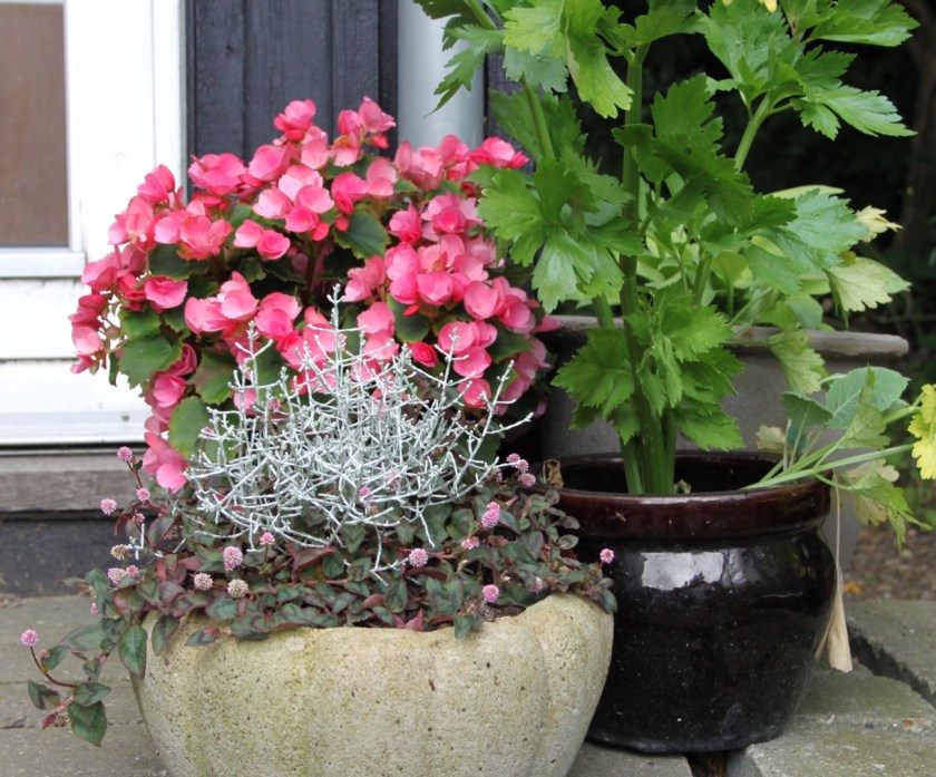 Sidste år stod der en lille opstilling på trappen ved baggangen. En Betulia, en potte med bladselleri (på grund af den fine, lysegrønne farve – at jeg så kom til at tænke på suppe, hver gang jeg gik ud eller ind, er en anden sag…), og en sammenplantning med sølvlyng og en lille fyr, jeg ikke kender navnet på.