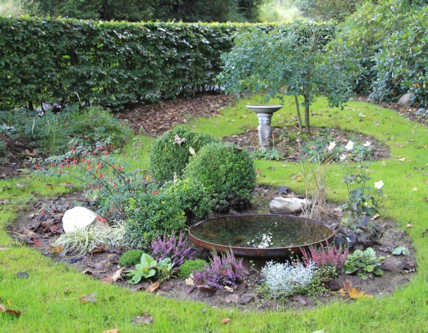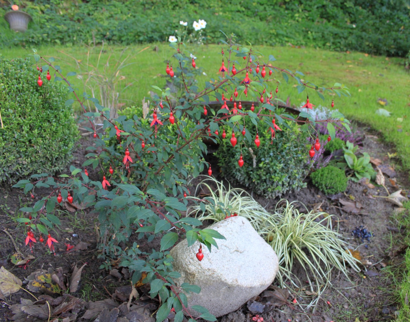 Og sådan en Kristi Bloddråbe, en havefuchsia, står der i det bed, hvor vi har udvidet til spejlbassinet.