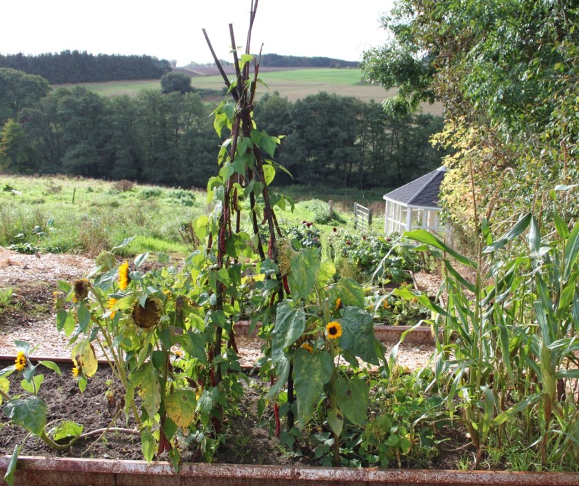 Derfor hænger der også stadig enkelte bønner på stativet. De skal modne helt og blive frø til næste års smukke og lækre, rødbrogede bønner.
