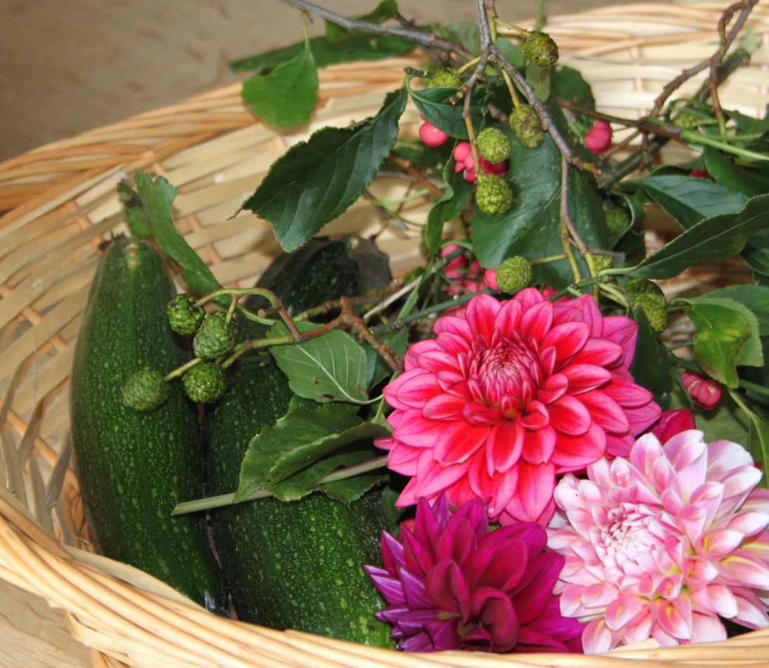 Vejen hjem går lige forbi højbedene, og i går var der et par små squash og lidt georginer at plukke med hjem. Der kommer stadig squash, selvom tempoet er sat betragteligt ned.