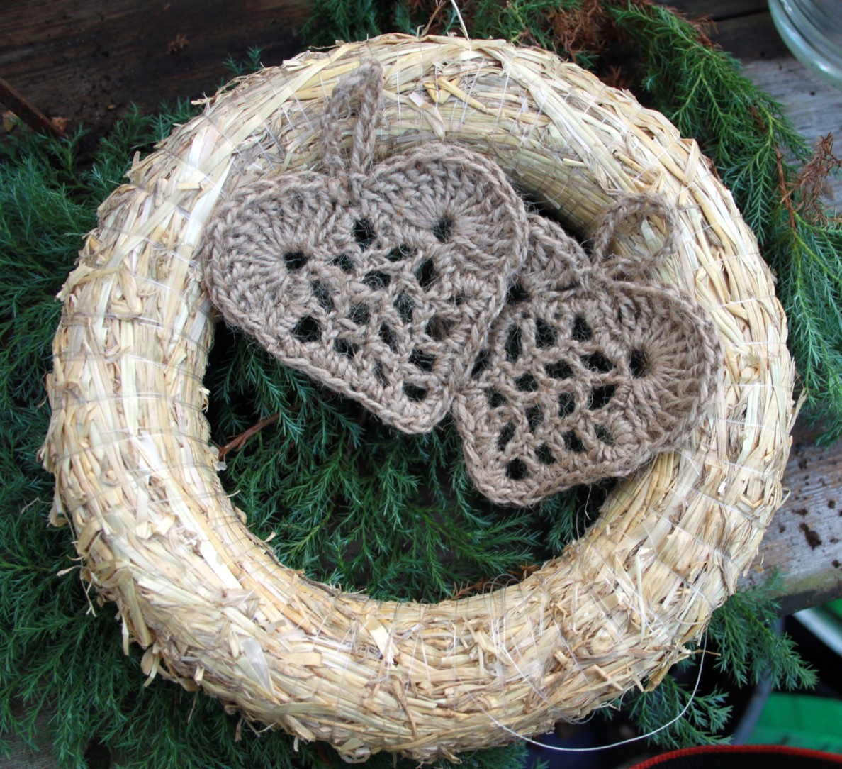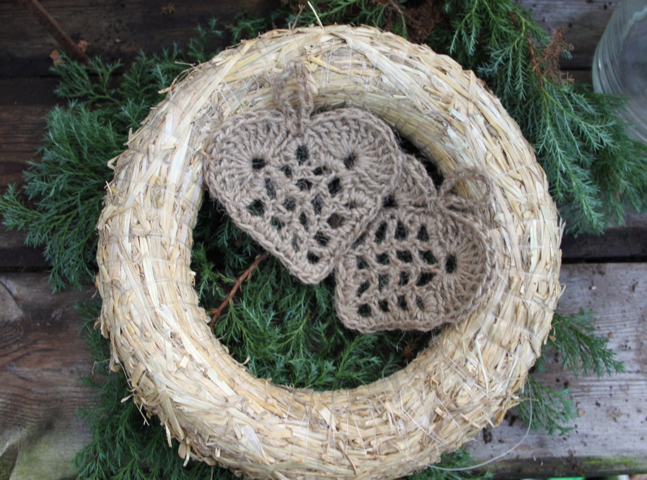 Rustik pynt med et strejf af nostalgi. For opskriften er den samme som den opskrift, der blev brugt til de små hæklede julehjerter, du måske kan huske? Små røde hjerter, hæklet i fint, tyndt garn. Altid røde. En sværm af dem blev hængt på troldegrene, anbragt i en keramikvase og stillet på et bord et sted. Gerne på et lille Wegner sybord – det med den flettede garnskuffe under. Tidsbillede – klik….