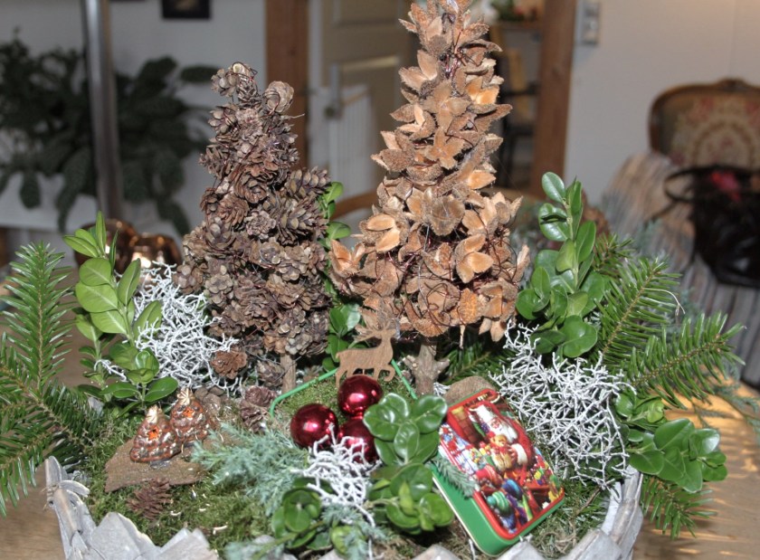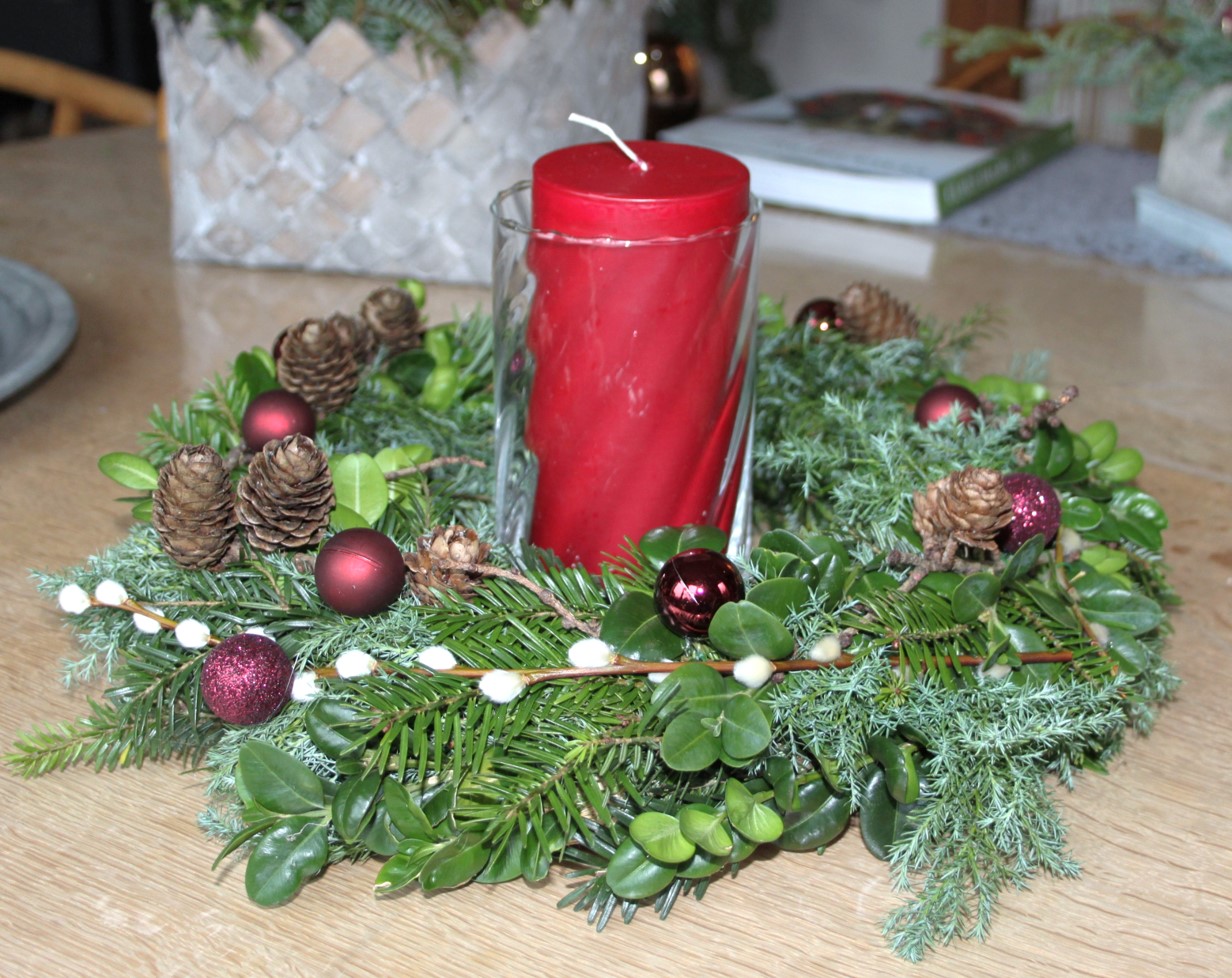 Sidste års dekorationer var meget forskellige. Den til bordet var en krans med et lys i glas. I glas, fordi man aldrig ved, om de nu også husker at puste lyset ud.
