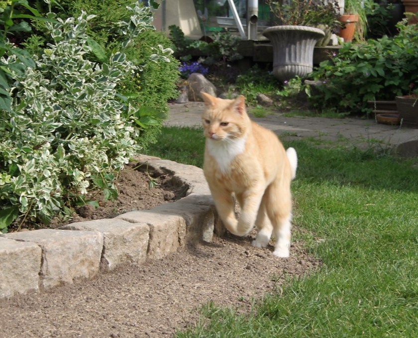 I juli tog jeg mange billeder, jeg er rigtig glad for. Ikke mindst alle dem fra de botaniske haver i Italien. Men alligevel foretrækker jeg nu billedet af Puma, der leger i den løse jord med nysået græs langs den nye stenkant på bedene i blomsterhaven. Ikke for skarphed – men for liv og bevægelse.