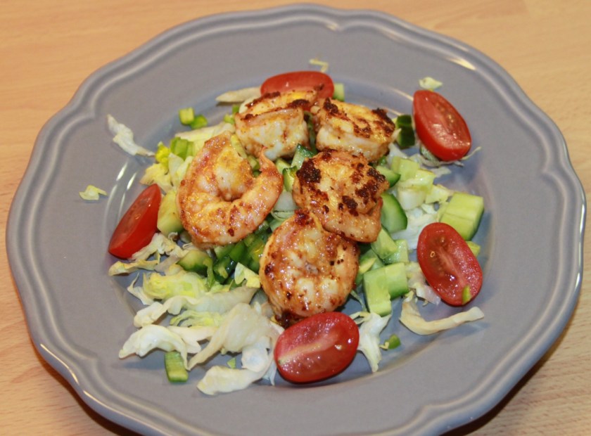 Stærke, men ikke for stærke. Lige tilpas og friske med den sprøde salatbund. En rigtig god forret eller frokostret – afhængigt af, hvor mange rejer, du laver til hver.