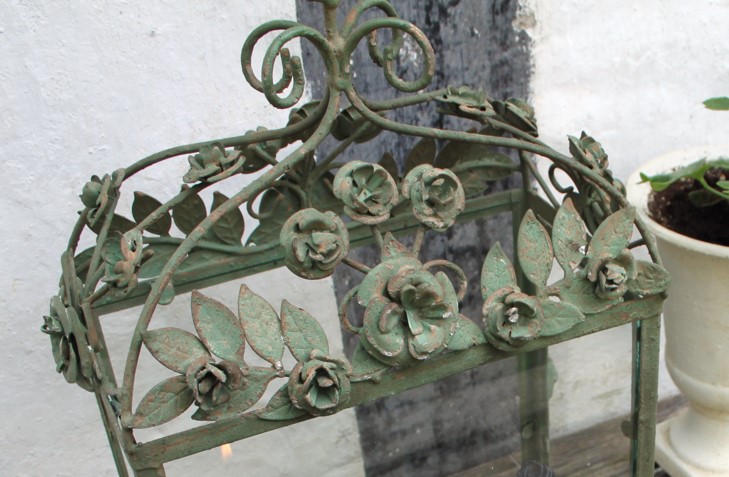 Det er virkelig en lanterne, der taler til romantiske sjæle. Og samtidig er den praktisk. Åbningen er i siden, så der ikke skal flyttes på den fine top med de kønne blomster og løv – og man brænder sig derfor heller ikke på den.