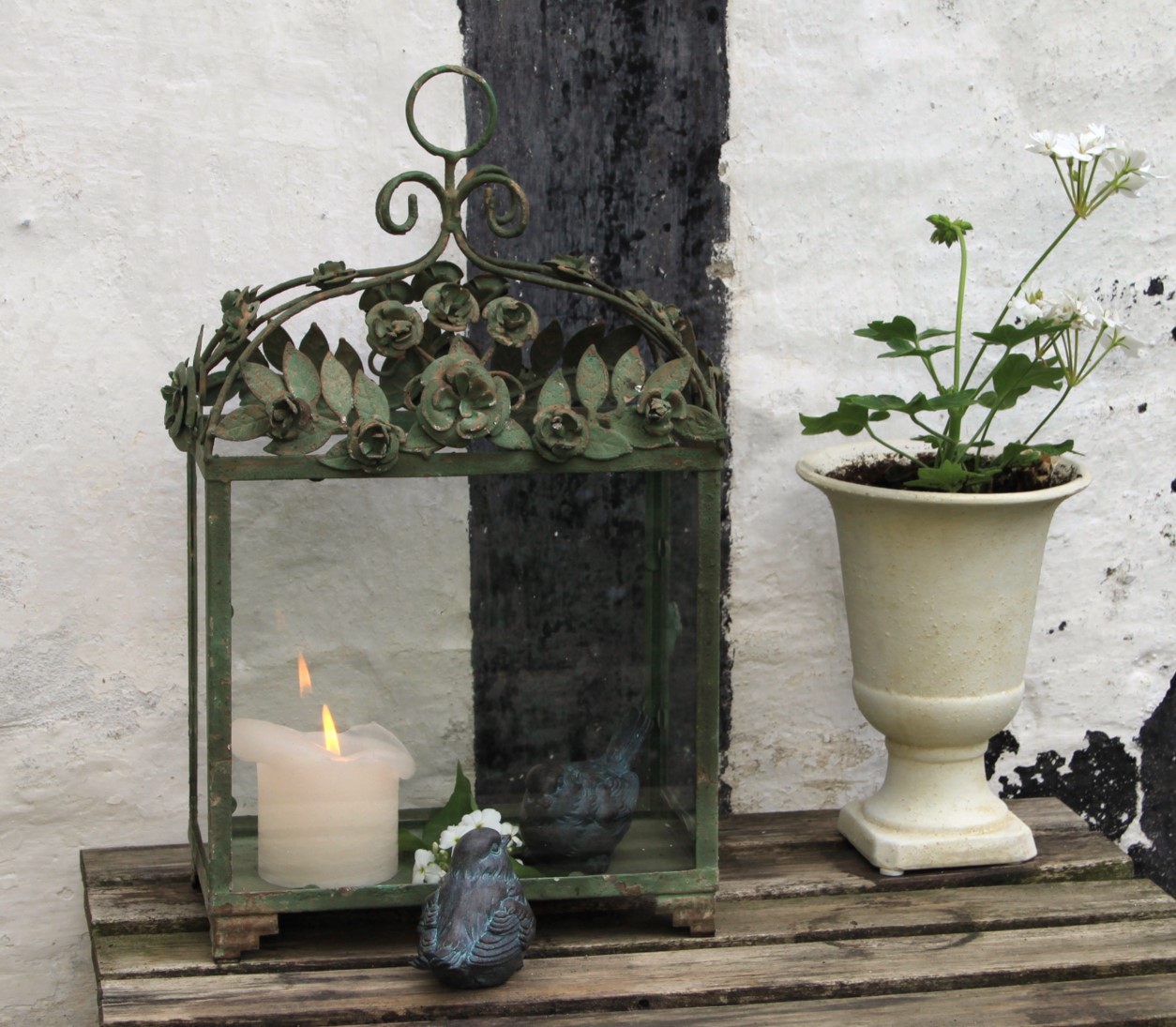 Det er virkelig en lanterne, der taler til romantiske sjæle. Og samtidig er den praktisk. Åbningen er i siden, så der ikke skal flyttes på den fine top med de kønne blomster og løv – og man brænder sig derfor heller ikke på den.