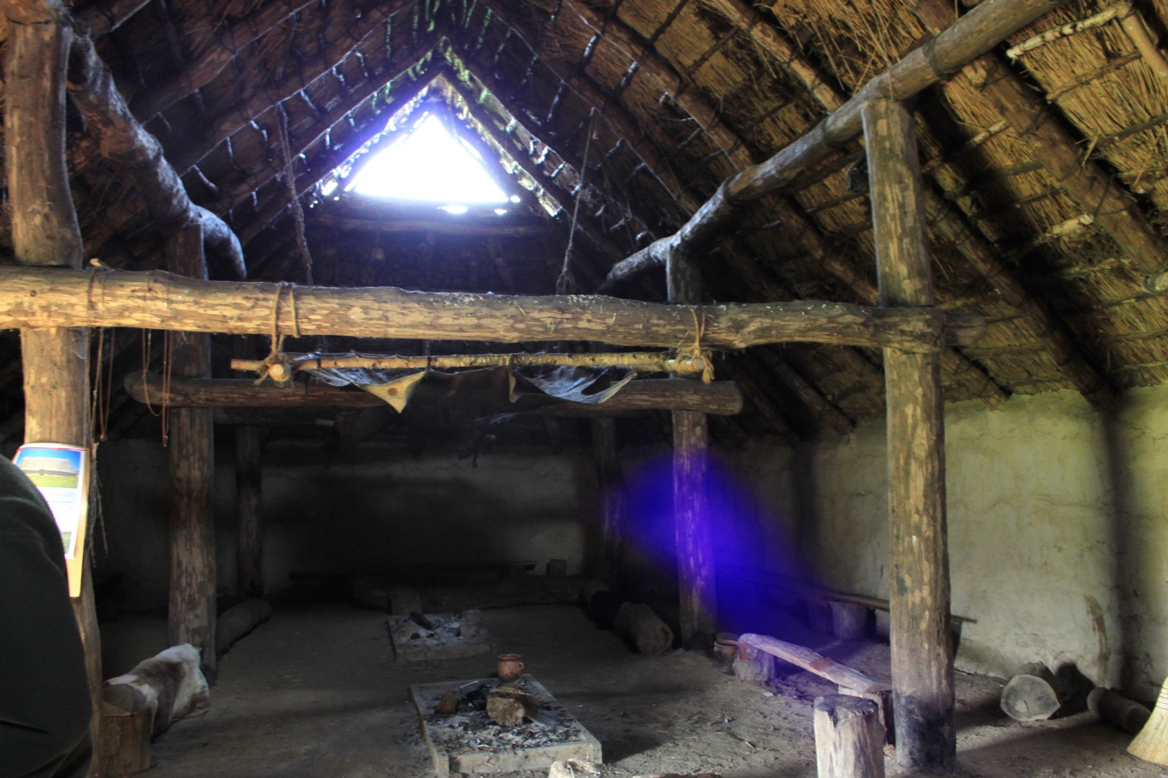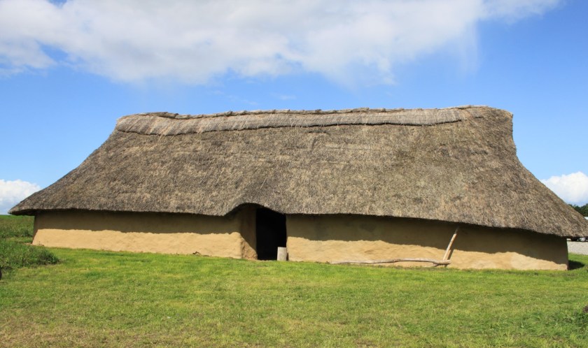 Huset er lerklinet, stråtækt og med plads til mennesker og dyr i samme hus. I gavlen er der huller, hvor lyset kan slippe ind, og røgen fra bålet kan slippe ud.