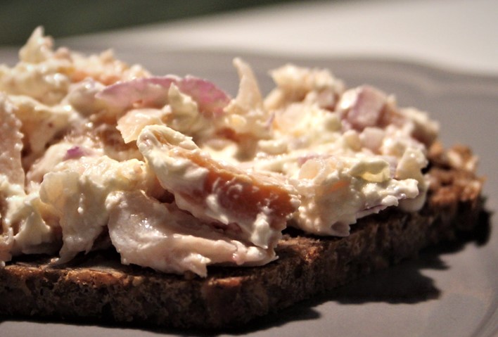 Pluk ørreden i småstykker og mos den groft sammen med flødeosten og de hakkede rødløg. Sådan. Det var det. Mere skal der ikke til.