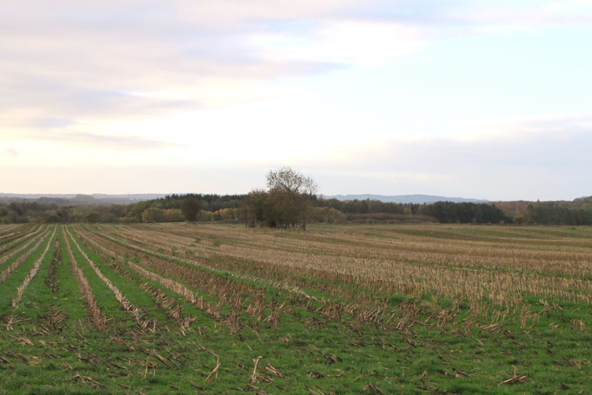 På majsmarken et par hundrede meter oppe ad vejen – den, der stod som en grøn, høj skov i sommer – ‘ser man nu kun sorten muld og stubbene de golde’.