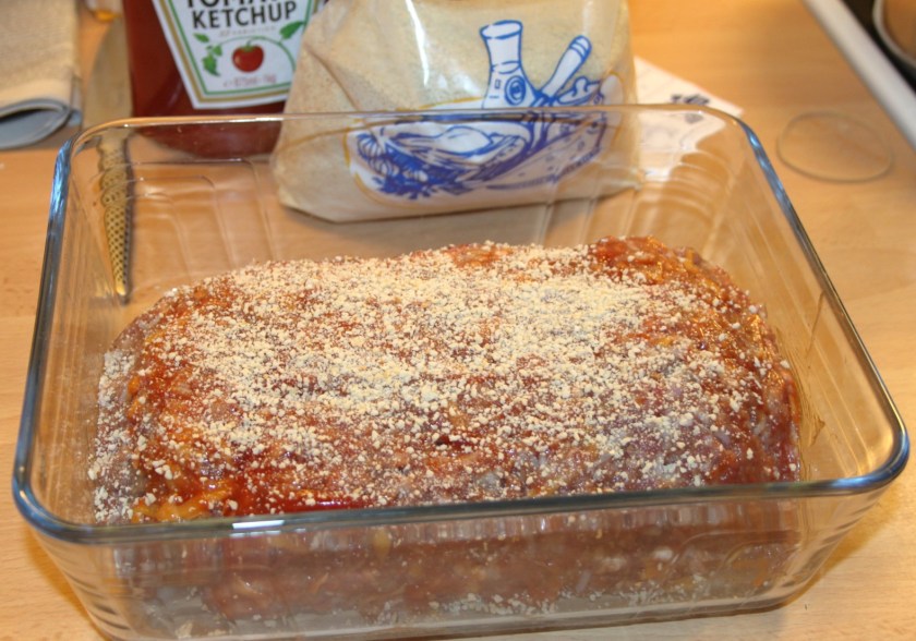Form enderne og brug sølvpapiret til at lempe hele herligheden over i et ovnfast fad. Smør farsbrødet med ketchup og drys med lidt rasp.