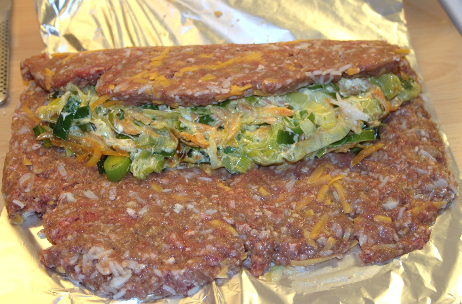 Som sagt er det en ‘undgå madspild’ opskrift. Man kan variere fyldet efter, hvad grøntsagsskuffen gemmer – andre groftrevne rodfrugter som pastinak, persillerod og selleri ville også smage godt i farsbrødet – og man kan variere farsen, som man har lyst. Strække den med en rest ris, røre revet gulerod i farsen – eller bruge svinekød, hvis man ikke har oksekød på lager.