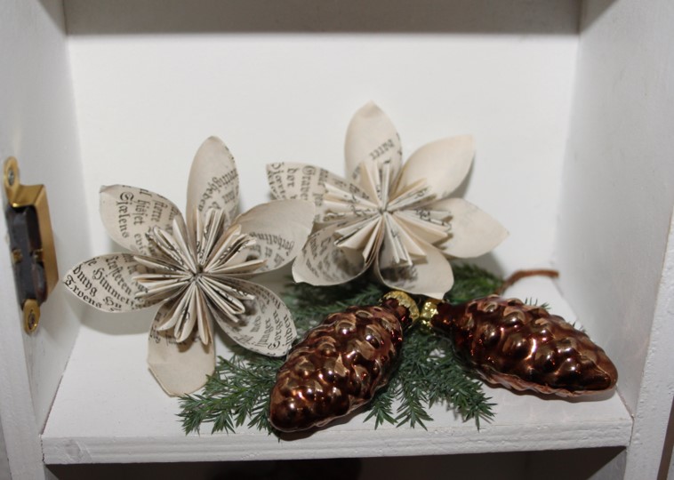 Og det bedste billede – i hvert fald det roligste billede – er billedet af de foldede juleblomster inde i det lille skab.
