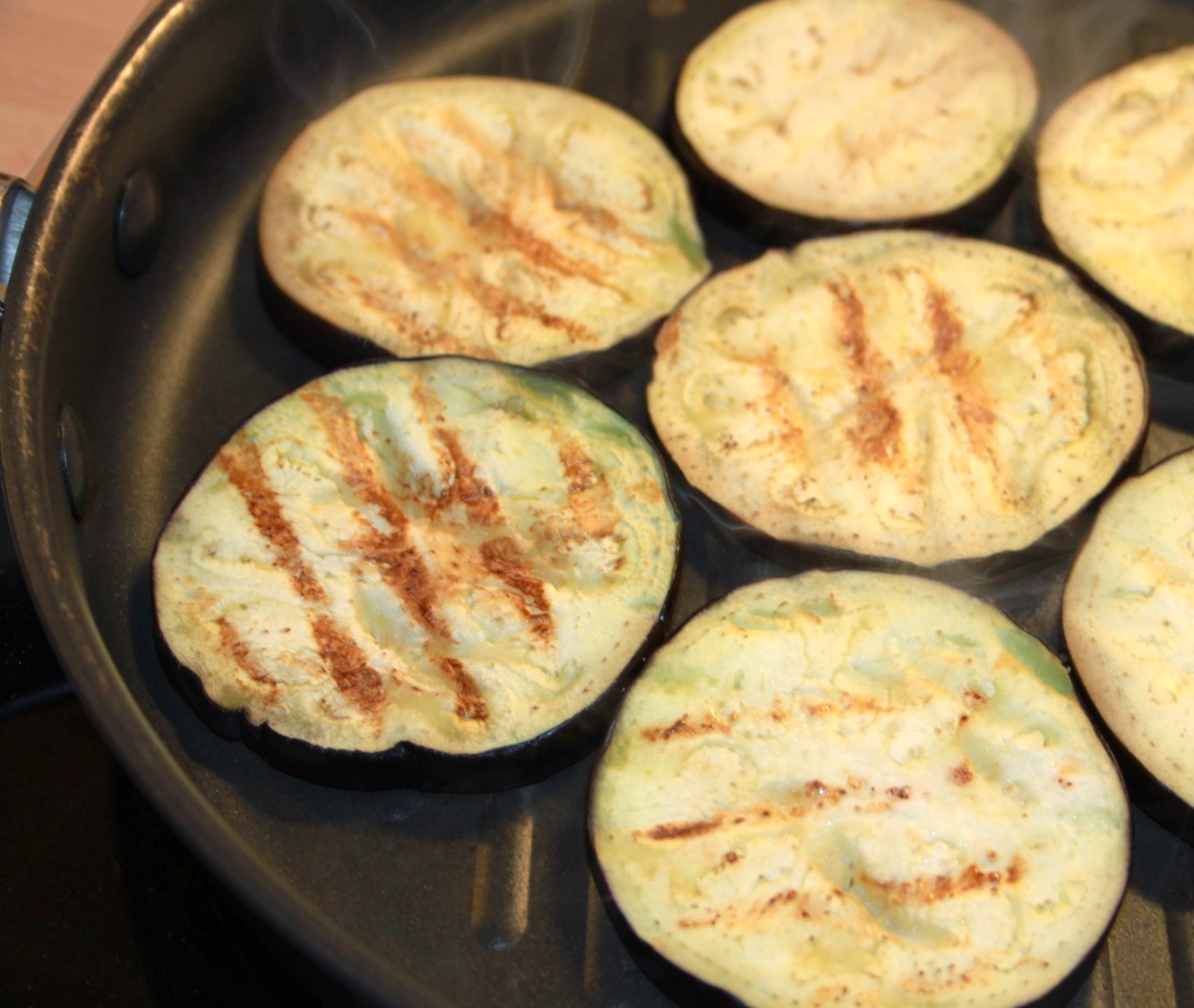 Start med at skære auberginen i skiver. Drys skiverne med salt og lad dem trække vand ud i en times tid. Skyl dem, smør dem med lidt olivenolie og steg dem på en grillpande, til de er gennemstegte og bløde.