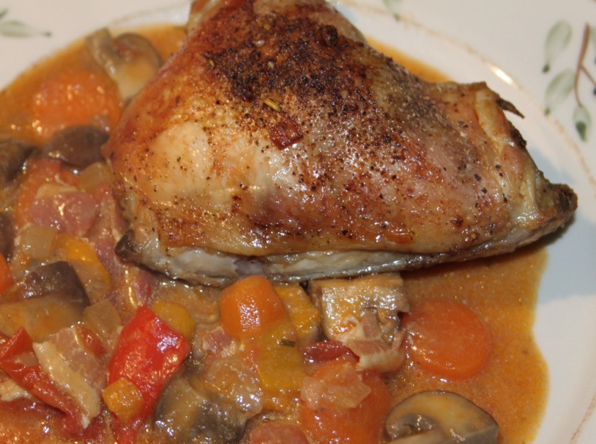 Det startede med, at jeg fik øje på en pakke kyllingeoverlår til en tyver og så nogle smukke, brune champignon i Rema i går. Det blev til kylling i fad med blandt andet svampe, bacon, paprika og løg.