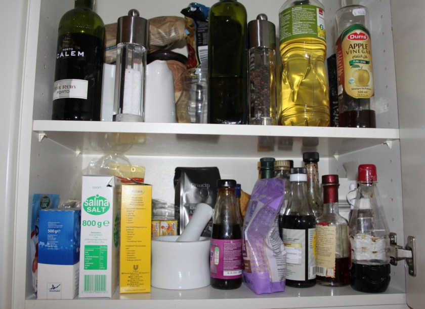 Skabet med olie, salt, sirup, soya, engelsk sovs og altså også eddike. Alle de ting, der skal til, når man godt kan lide varieret mad. Sådan et skab kan bare godt vokse en lidt over hovedet, når det sander til.