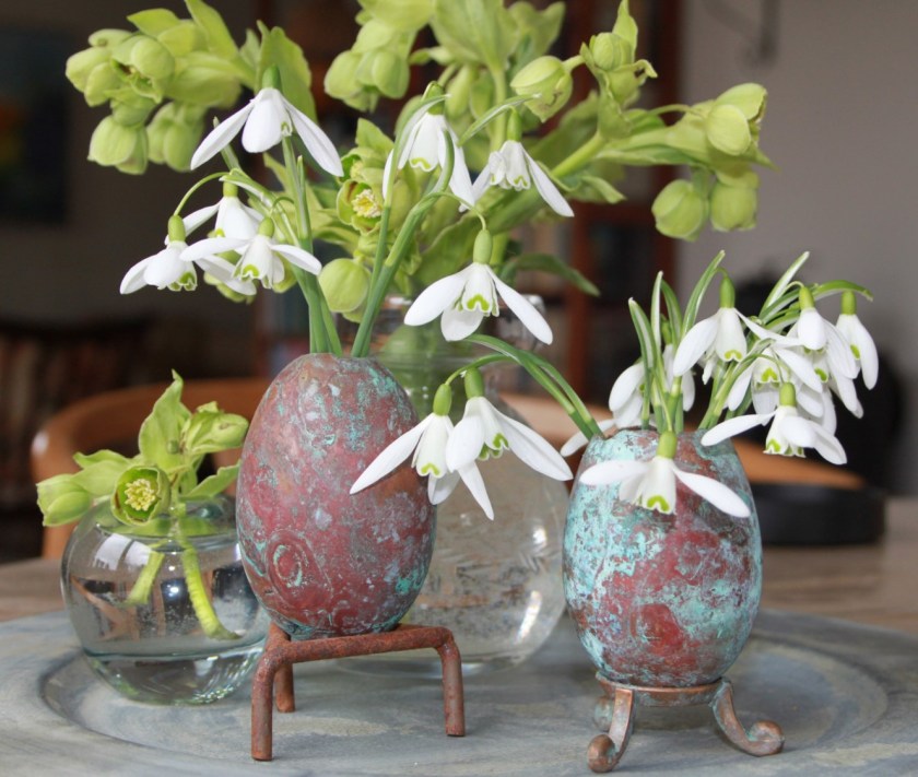 Jeg blev straks inspireret af billederne af sammenstillinger af små vaser med løgblomster og fandt nogle små vaser frem herhjemme. Det blev selvfølgelig helt anderledes end i bogen – andre vaser, andre blomster. Men jeg havde næppe gjort det lige sådan og lige her og nu, hvis ikke jeg havde fået ideen forærende i bogen.