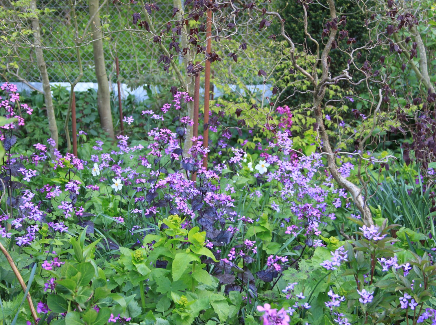 Det første sted, jeg søger hen i haven, er altid skovhaven. Der er sådan en dejlig stemning. Frodighed, lys og skygge, og et væld af blomstrende judaspenge.