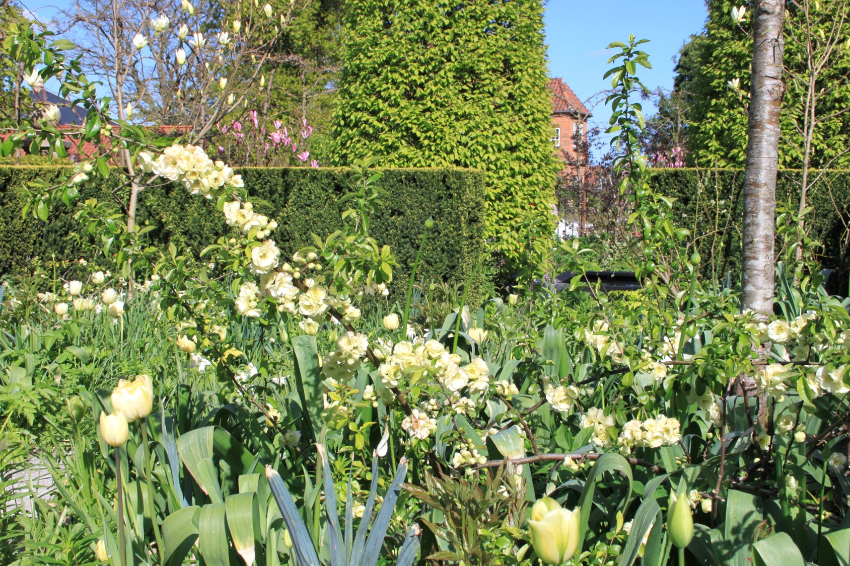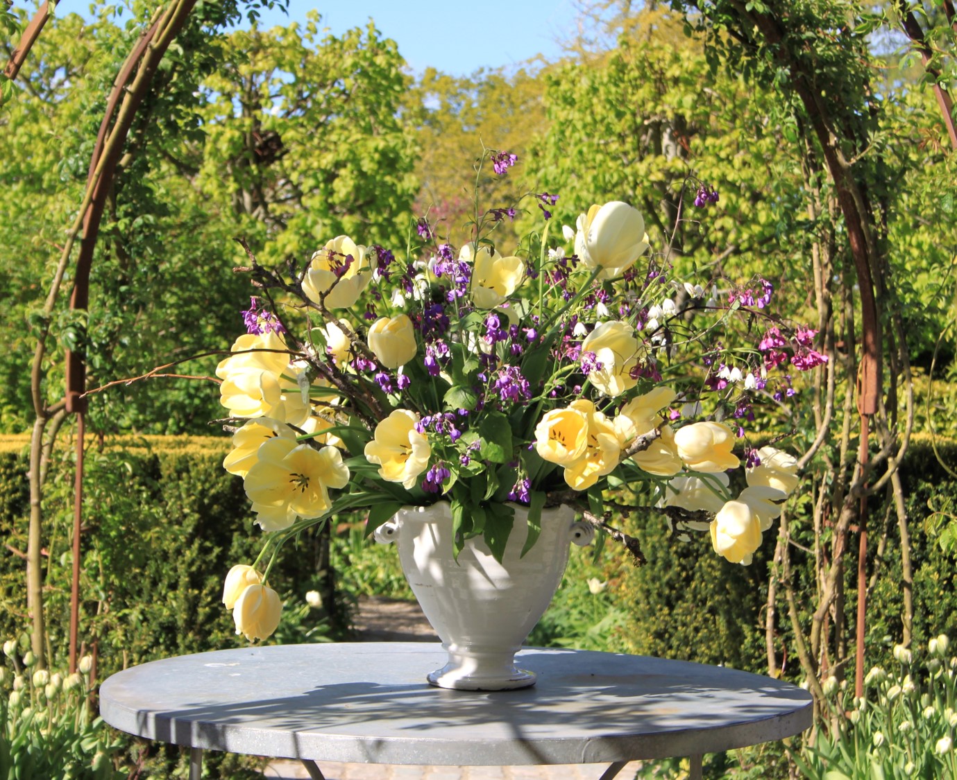 Det vilde og frodige look afløses hist og her af formelle arrangementer i form af overdådige krukker med tulipaner på pladsen ved buegangen.