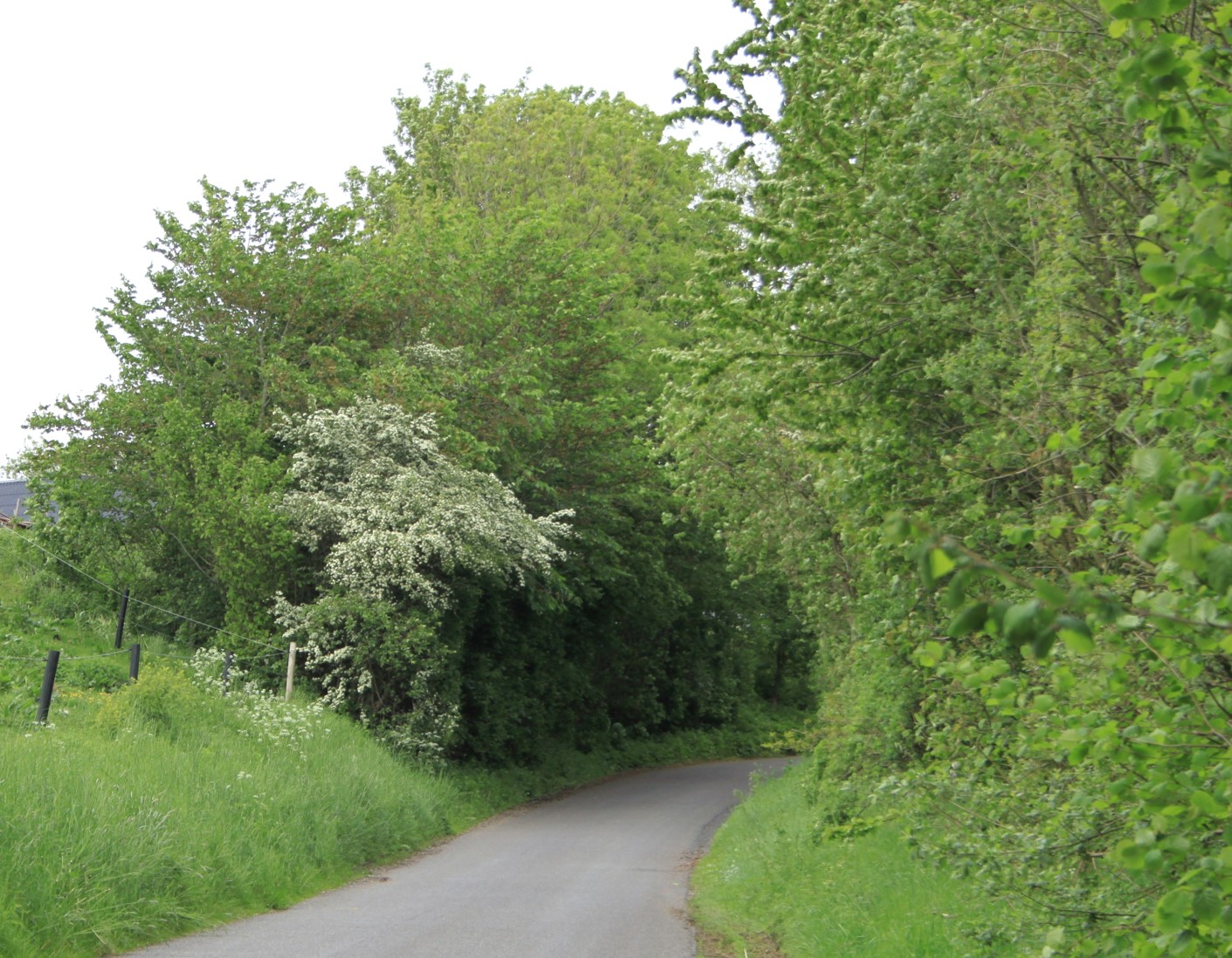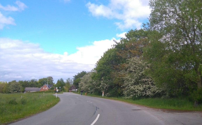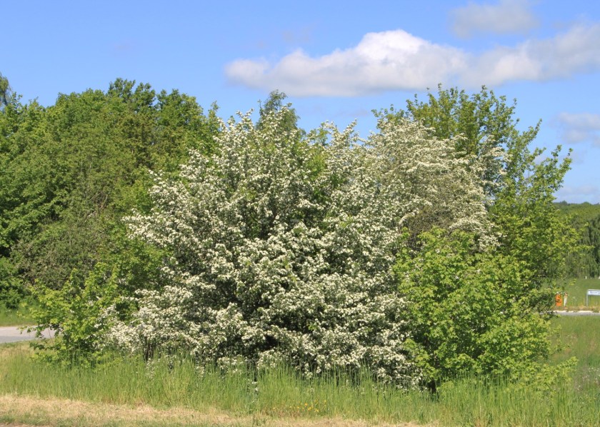 Det er især hvidtjørnen, der præger landskabet lige nu. Langs med landevejen,