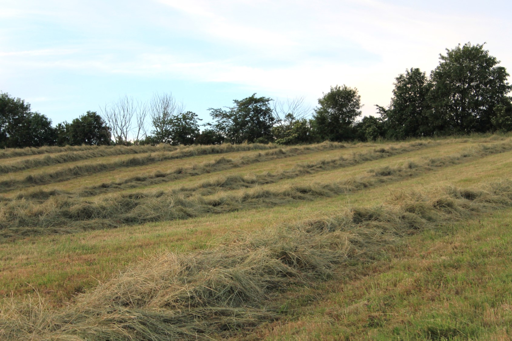 Høet blev nemlig presset på græsmarkerne. TV-køkken for køer.Tidligere på ugen var græsset blevet klippet (så man igen kan gå på marken – yesss!) og vendt et par gange. Nu var det tørt nok, og det blev revet sammen i lange bræmmer,