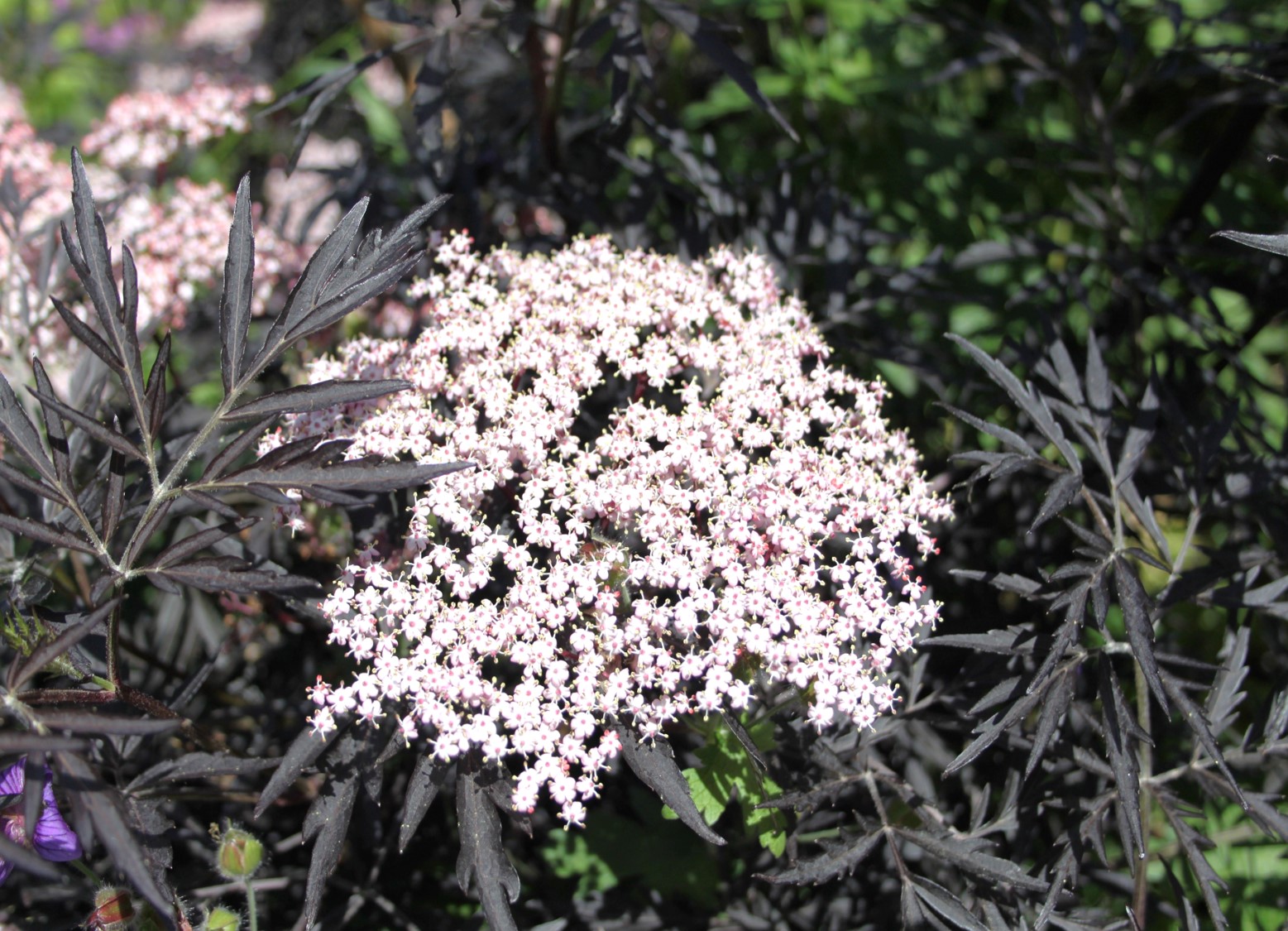 Dagene er lange, vejret er mildt og dejligt, og alt er overvældende frodigt. Hyldene dufter i stuen ind… også de fine lyserøde blomster på den mørke hyld, Black Lace.