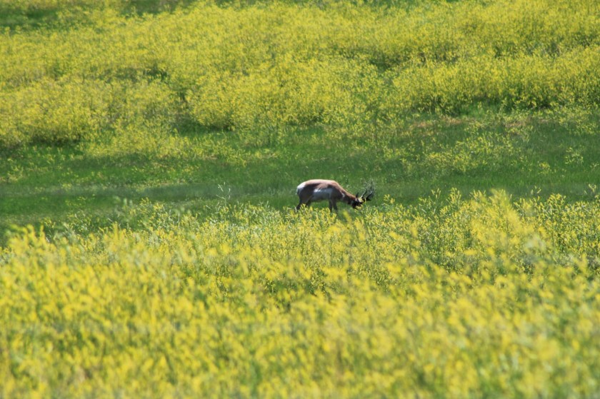 Den lille antilope på billedet er en Pronghorn – ikke ualmindelige, men ualmindeligt søde at se på. Vi kørte gennem kilometer efter kilometer af de gule blomster, og den krydrede duft fyldte bilen og lagde gult støv på instrumentbrættet.