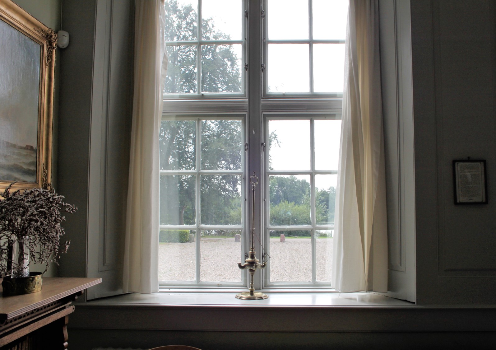 og kigger ud ad de gamle vinduer mod vandet.