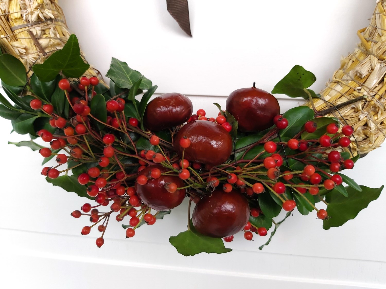Mariebær, buksbom og efeu er bundet på, og kastanjerne sidder fast med stykker af elefanttråd, der er stukket i kastanjen i den ene ende og i kransen på den anden. Til sidst en sløjfe og ophæng i brunt bånd, og nu er der smukt efterår på døren.