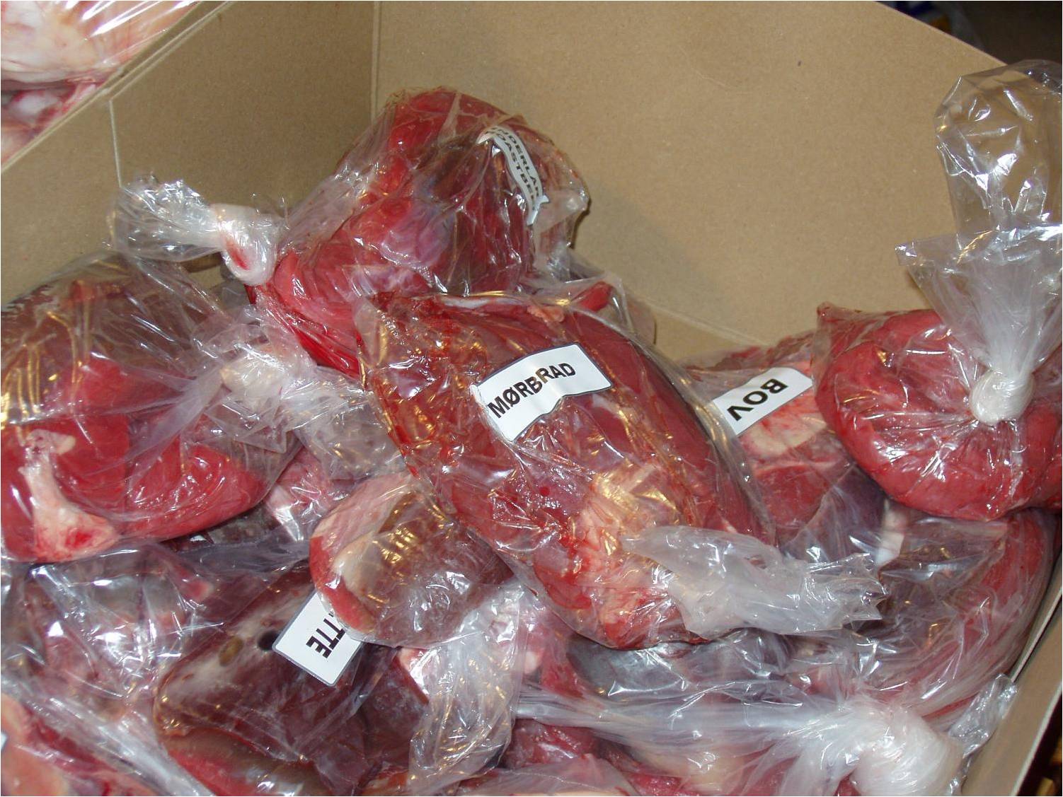 Kødet bliver leveret, som du ser på billederne. Pakket i poser, klar til frysning. Det er kun hakkekødet, du selv skal fordele i mindre portioner, før du fryser det. Husk at klappe pakkerne flade, så de fylder mindst muligt i fryseren
