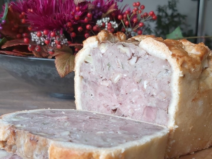 - En indbagt pate – en pie – eller på fransk en paté en croute – med and, æbler, valnødder og salvie med en sprød salat med rød spidskål, marinerede gulerødder og portvinssyltede tranebær til.