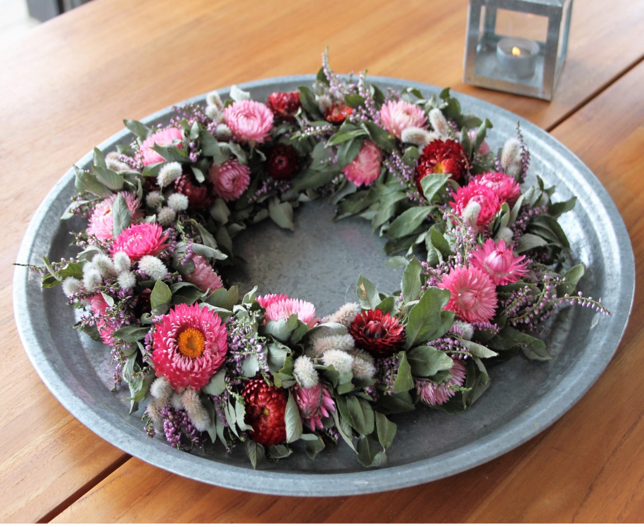 Kransen her med evighedsblomster så jeg hos Jeannett Fruergaard i august. Let og fin – og holdbar.
