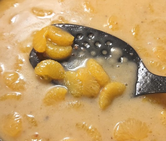 Steg dem i smør på en pande – cirka fem minutter på hver side. Tag dem af panden og hold dem varme. Kog panden af med appelsinlikøren (jeg brugte en billig fra Aldi…). Tilsæt appelsinsaft og bouillon samt saften fra dåsen med mandariner. Lad det koge ind i en 10 minutters tid og tilsæt så fløden. Når fløde og saft er kogt godt sammen, kan du smage til med salt og peber, og jævne sovsen lidt med Maizena rørt ud i lidt koldt vand. Til allersidst tilsætter du mandarinstykkerne og varmer sovsen godt igennem.