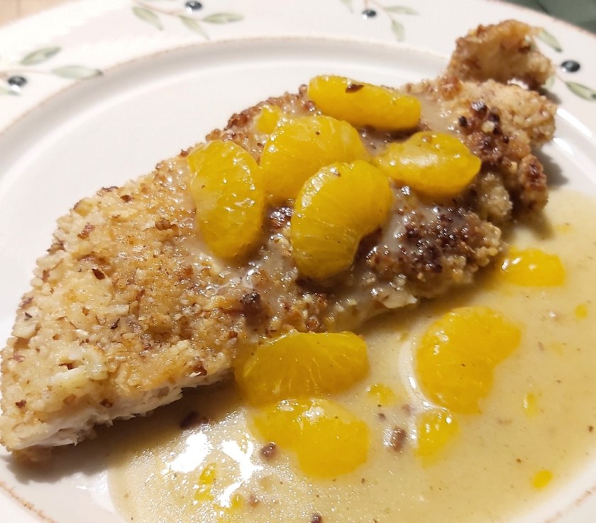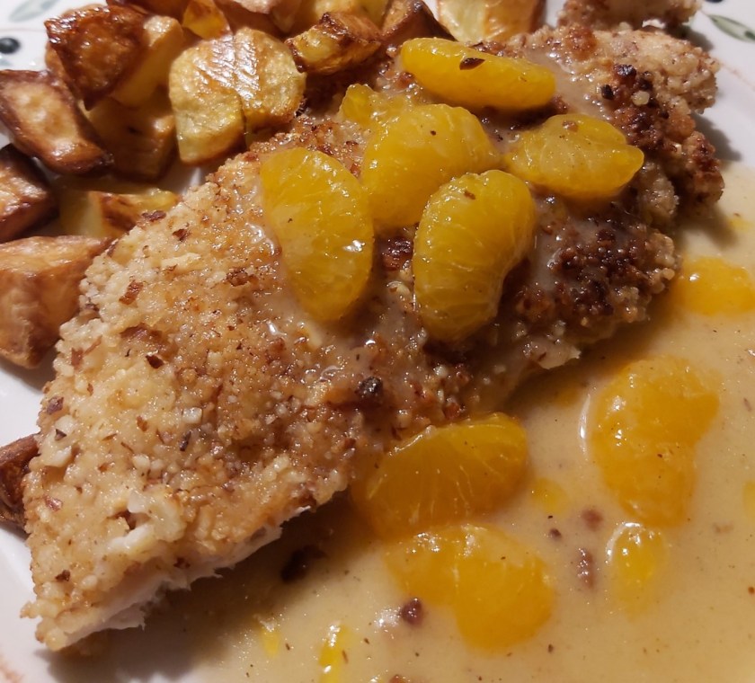 Du skal lige have en lørdagsopskrift. Den er ikke januar-slankende. Slet ikke. Men den er noget så god. Den møreste kylling indpakket i en sprød nøddepanering med en lidt speciel sovs, der blandt andet indeholder en dåse mandariner og en halv deciliter appelsinlikør. Sovsen er ikke dessertsød, men den får en dejlig afrundet smag med friskhed fra de små mandariner.