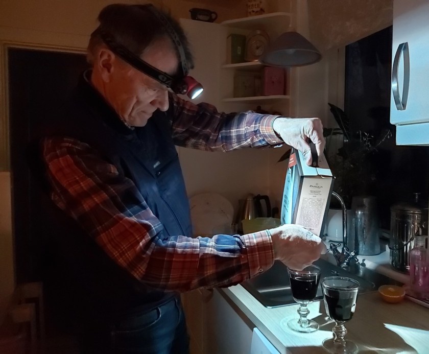 Ikke bare her i huset eller her i byen, men i hele området. Totalt mørkt. Husbonden greb pandelampen og skænkede os et glas vin. Det kunne vi jo lige så godt, mente han. Jeg var helt enig.