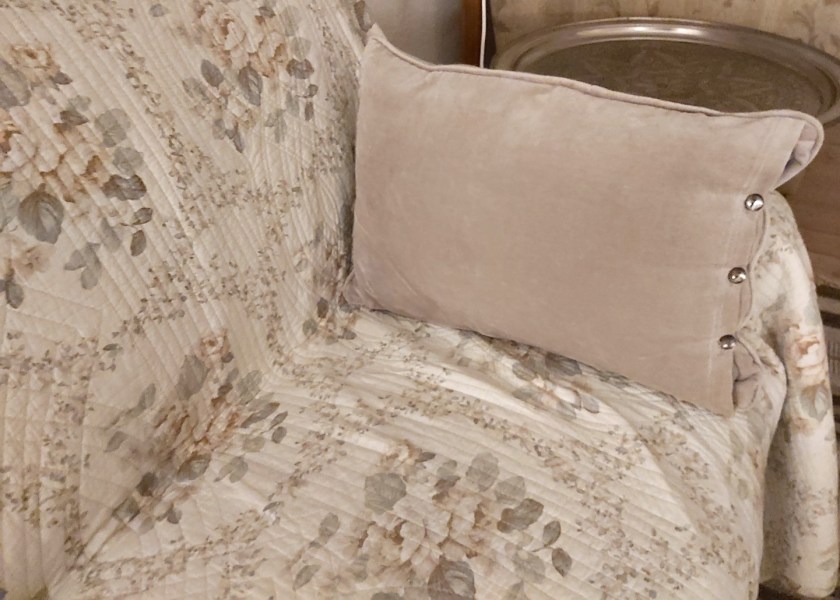 Tager tepotten og kopperne ud i køkkenet og sætter dem i opvaskeren. Glatter plaiderne og ryster puderne i sofaen og slukker lyset i stuen.