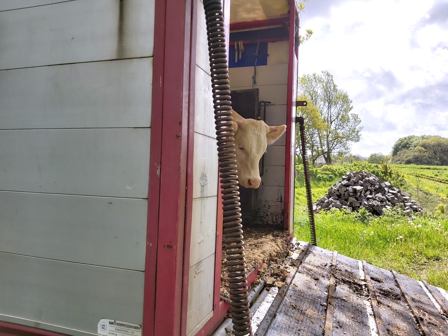 Da bagklappen blev slået ned, og køerne kunne gå ud, gik der alligevel lige lidt, før de vovede sig frem. Det derude var da noget helt andet end det trygge mørke inde i bilen, hvor de havde tilbragt de sidste par timer, og nu lå de lige så godt, og der var stadig hø tilbage. Så hvad havde vi gang i?!?
