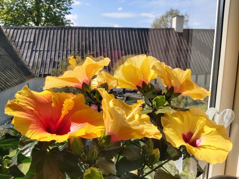 Nu bliver der lidt mere plads, for potterne med hibiscus flytter ud i eftermiddag, når jeg kommer hjem. Så kan de stå der og blomstre hele sommeren og tilføje et eksotisk glimt til vores landhave.