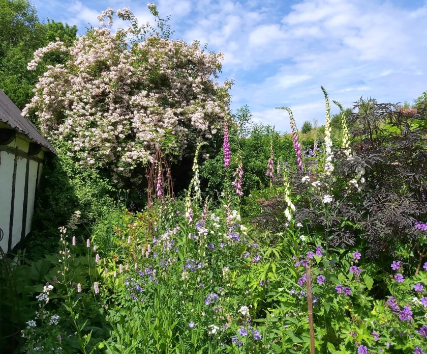 I juni måned er jeg rigtig tilfreds med haven. Der har den det småvilde cottage look med blomster alle vegne. Det er helt overdådigt, for der er et mylder uden lige.
