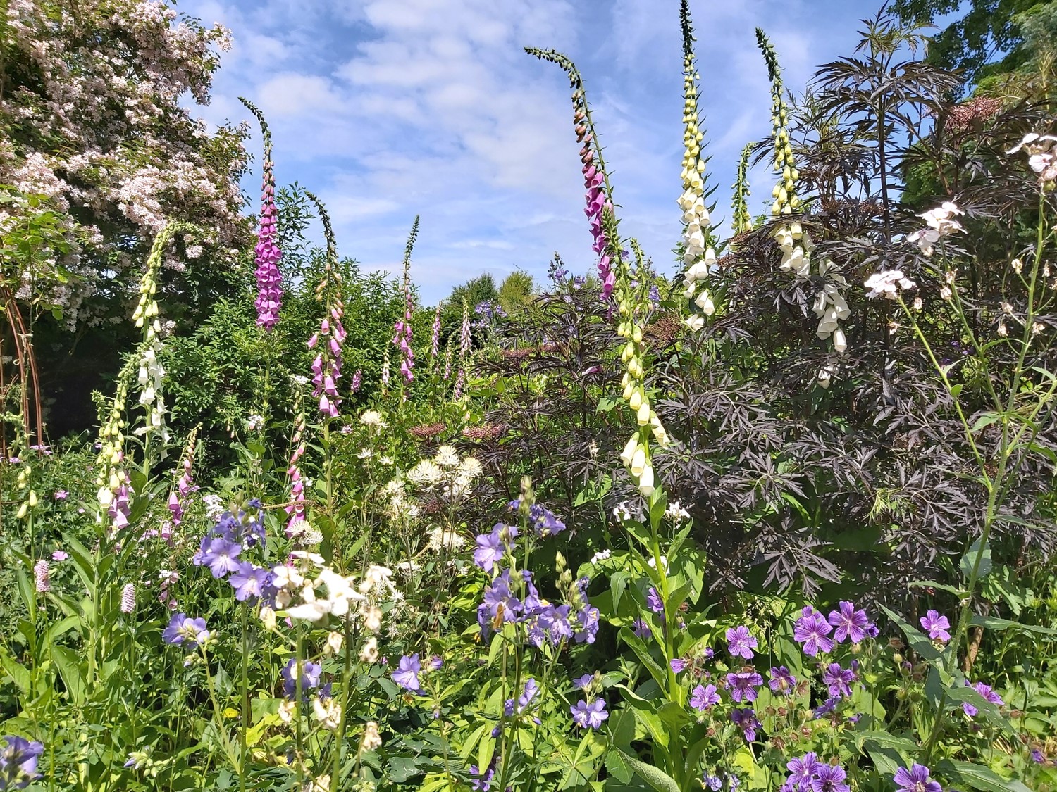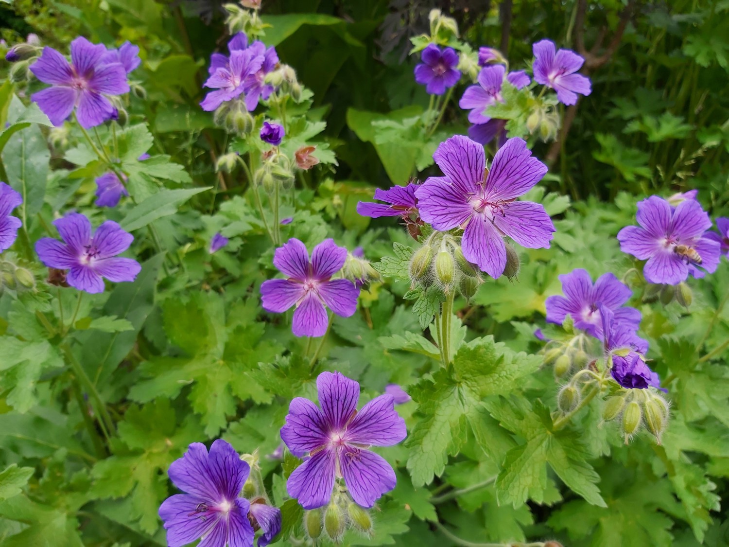 Imellem dem blomstrer storkenæb i store puder i lyserødt og forskellige lilla nuancer.