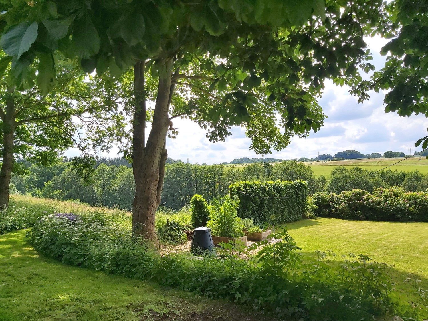 Efter at have badet øjnene i blomsterfarver, falder der ro på, når man går ud i udsigtshaven og ser ud over det rolige, grønne midsommerlandskab.
